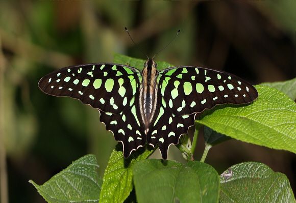 Bướm màu nền đen với các dải và đốm màu xanh lục.