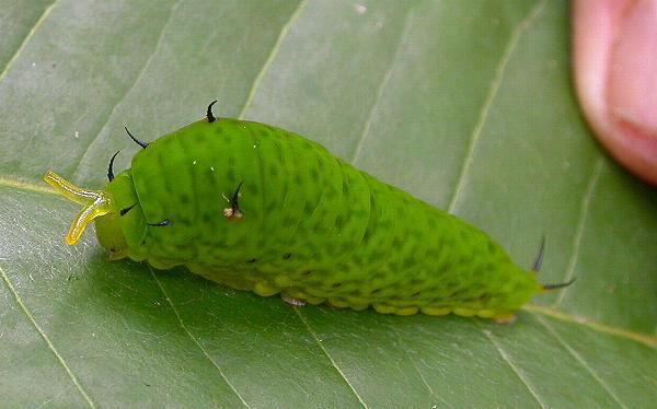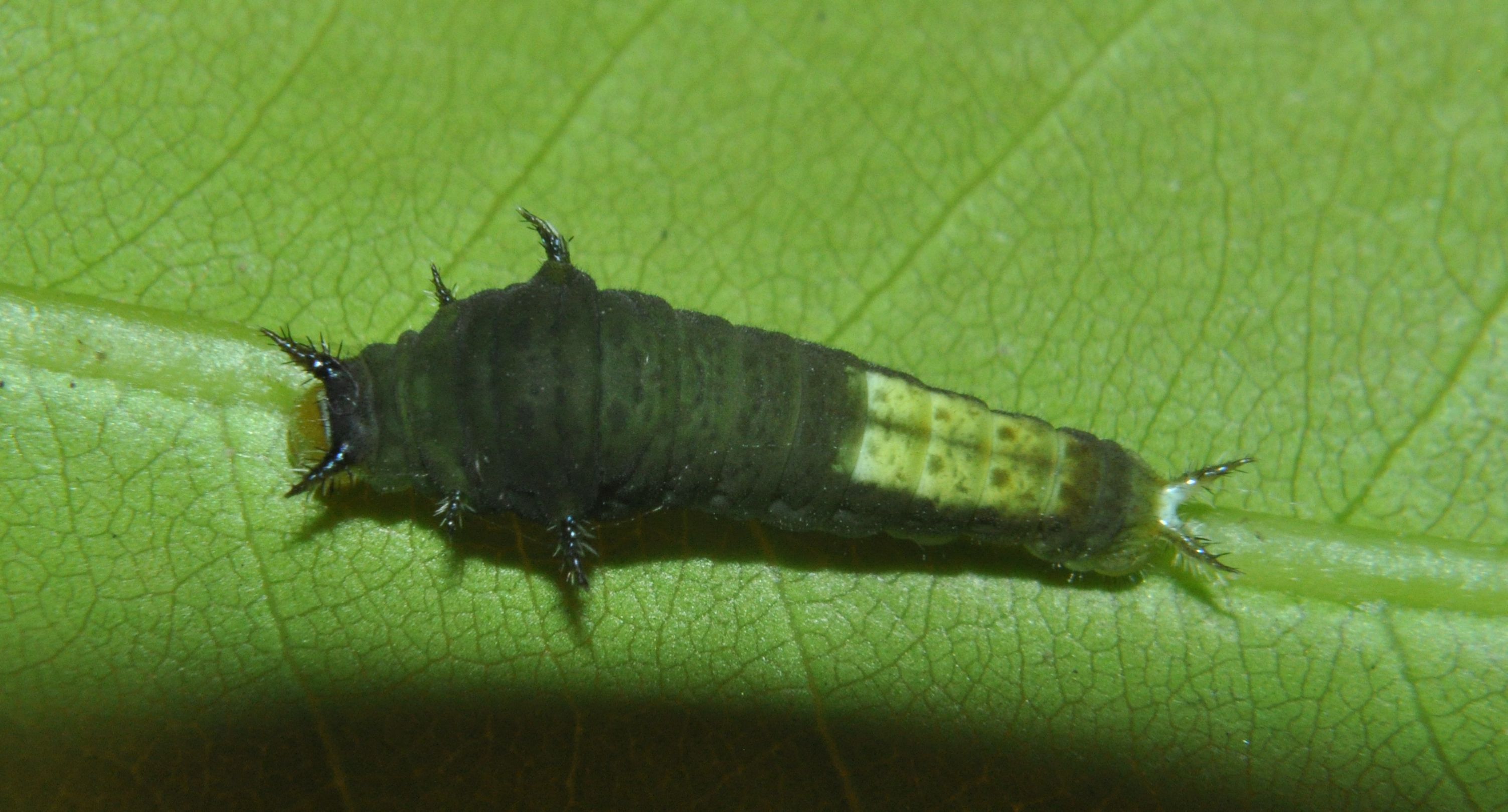 - Mặt trên: cánh trước con đực có một dãy các chấm chạy dọc theo mép trên lưng của cánh; một dãy chấm khác ở vùng trung tâm, dãy thứ 3 được tạo thành bởi 5 chấm chấm kép; một dãy chấm khác ở vùng đĩa cánh và một dãy chấm nữa chạy dọc theo mép cánh; ở vùng gốc cánh có những chấm đơn nằm ngang. Trên cánh sau có một chấm dài chạy từ gốc cánh xuống đến đoạn giữa mép bụng cánh, ngắt quãng tại đó rồi lại tiếp tục kéo dài đến gần cuối mép bụng cánh; còn có một dãy các chấm ở đĩa cánh và dãy các chấm chạy theo mép cánh. Bụng có màu đen.